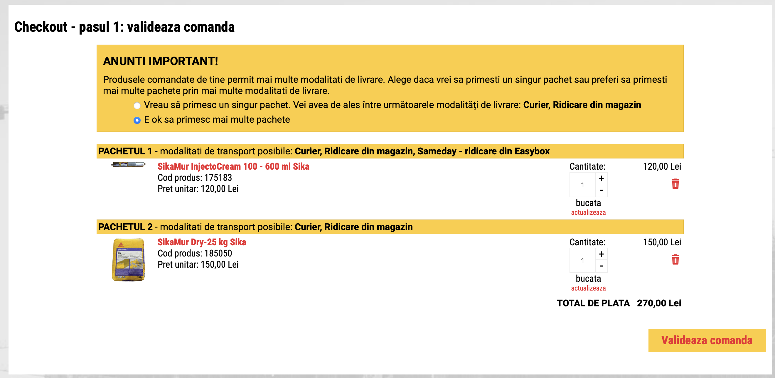 - apare pasul 1 = secventa de validare : bifati daca vreti sa trimiteti mai multe pachete: vreau 1 pachet sa ajunga la Easybox si 1 pachet care nu incape in Easybox sa vine cu curier la usa: